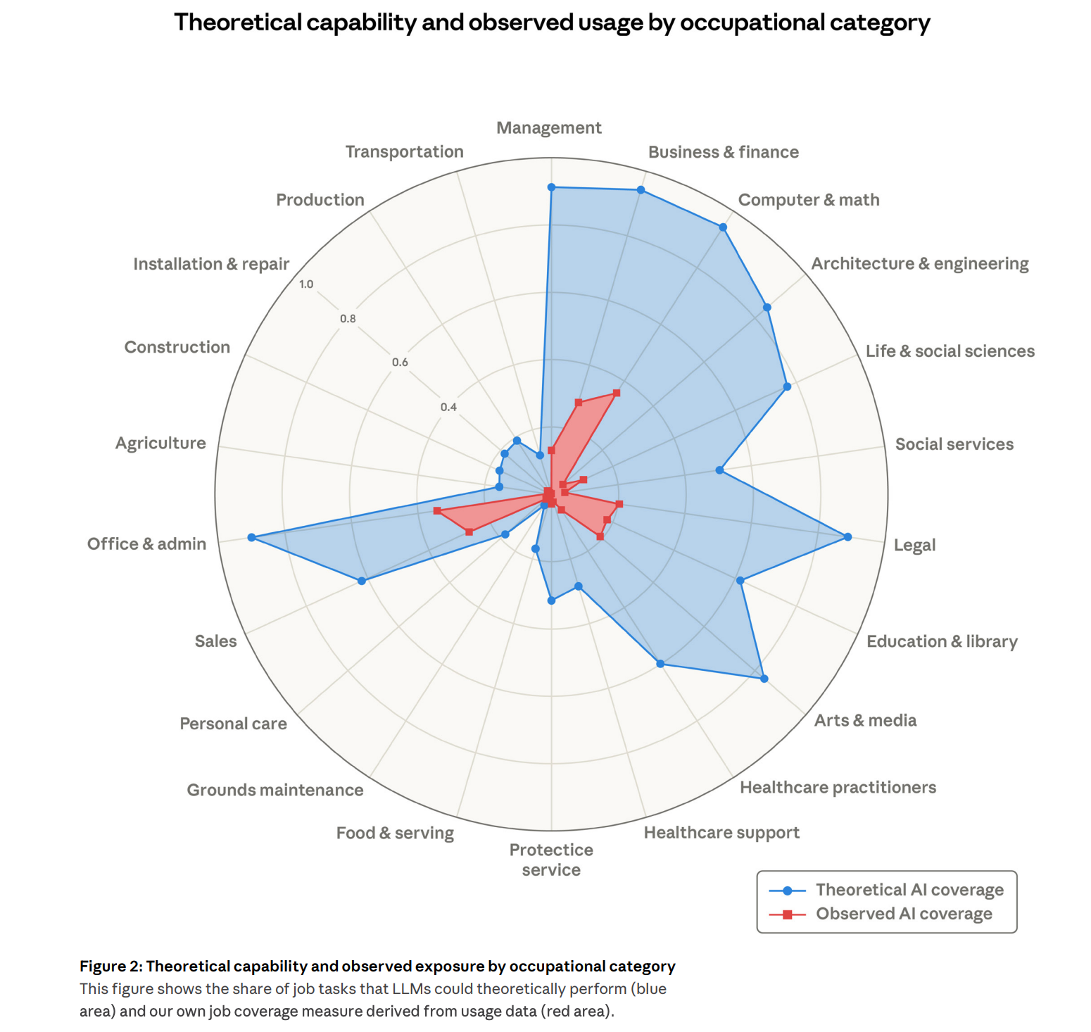 El viernes salió el siguiente gráfico y no tardé en verlo en stories y publicaciones varias de internet. Se trata de un estudio que habla de cómo la IA va a quitarnos el trabajo. En este dibujito tan mono se ve una comparación: los trabajos que la IA puede teóricamente hacer, y aquellos que realmente está haciendo.