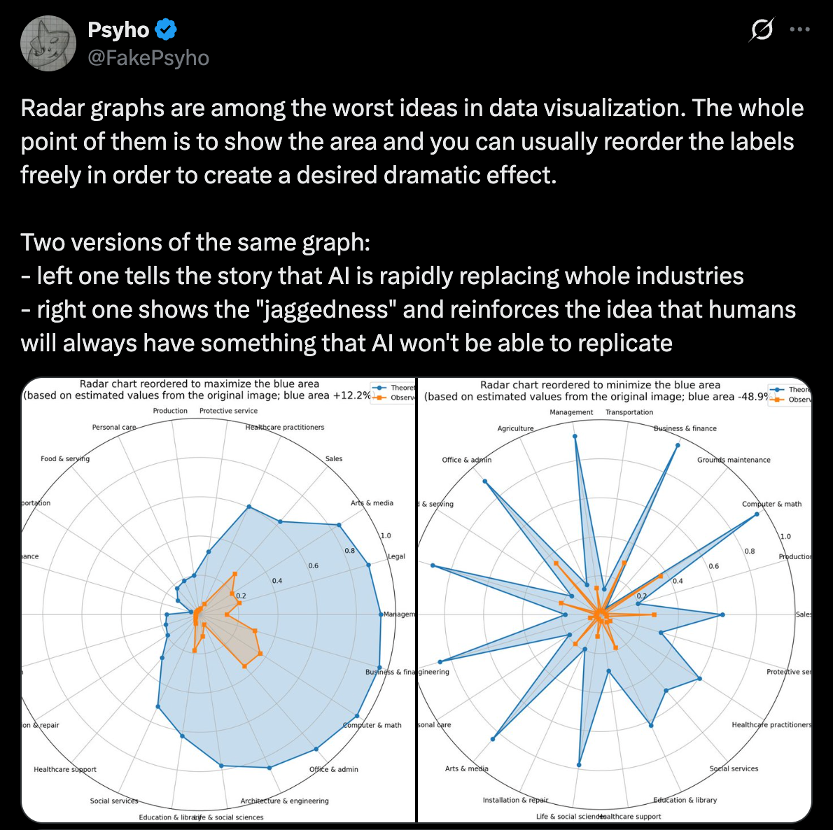 Y así es cómo han creado esa aberración de gráfico, que en una muy cuestionable forma de radar, insinúa que algunas ocupaciones están "cooked", como dicen los jóvenes hoy en día.