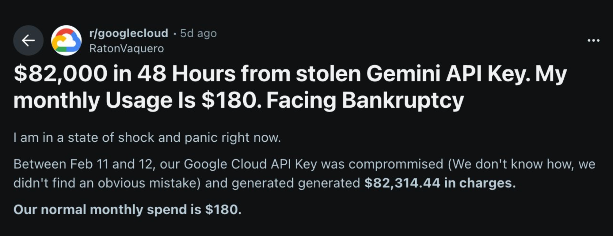 2- Exponer las claves APIs. Pongo un ejemplo de Gemini pero puede pasar en cualquiera. Si un actor malicioso compromete tu clave API se te puede subir la factura más que la factura de la luz en un pueblo de Wisconsin cerca de un centro de datos.