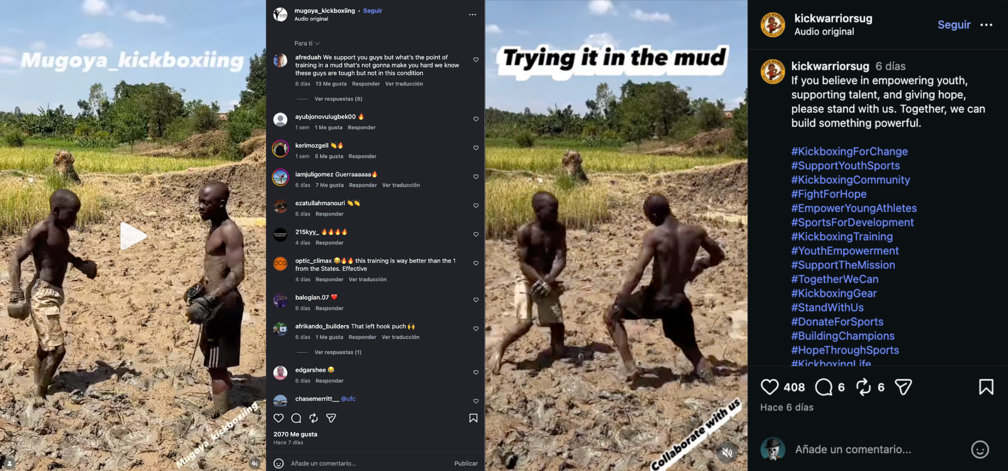 Los vídeos de los niños de Uganda peleando se están volviendo muy virales. En los cuatro o cinco días que llevo siguiendo el caso ya he visto varios movimientos. La cuenta de Mugoya Kickboxing ha empezado a enseñar algún paquete que en teoría ha donado alguien. La cuenta de Kickwarriors Uganda, en cambio, ha borrado el segundo gofundme (probablemente falso).