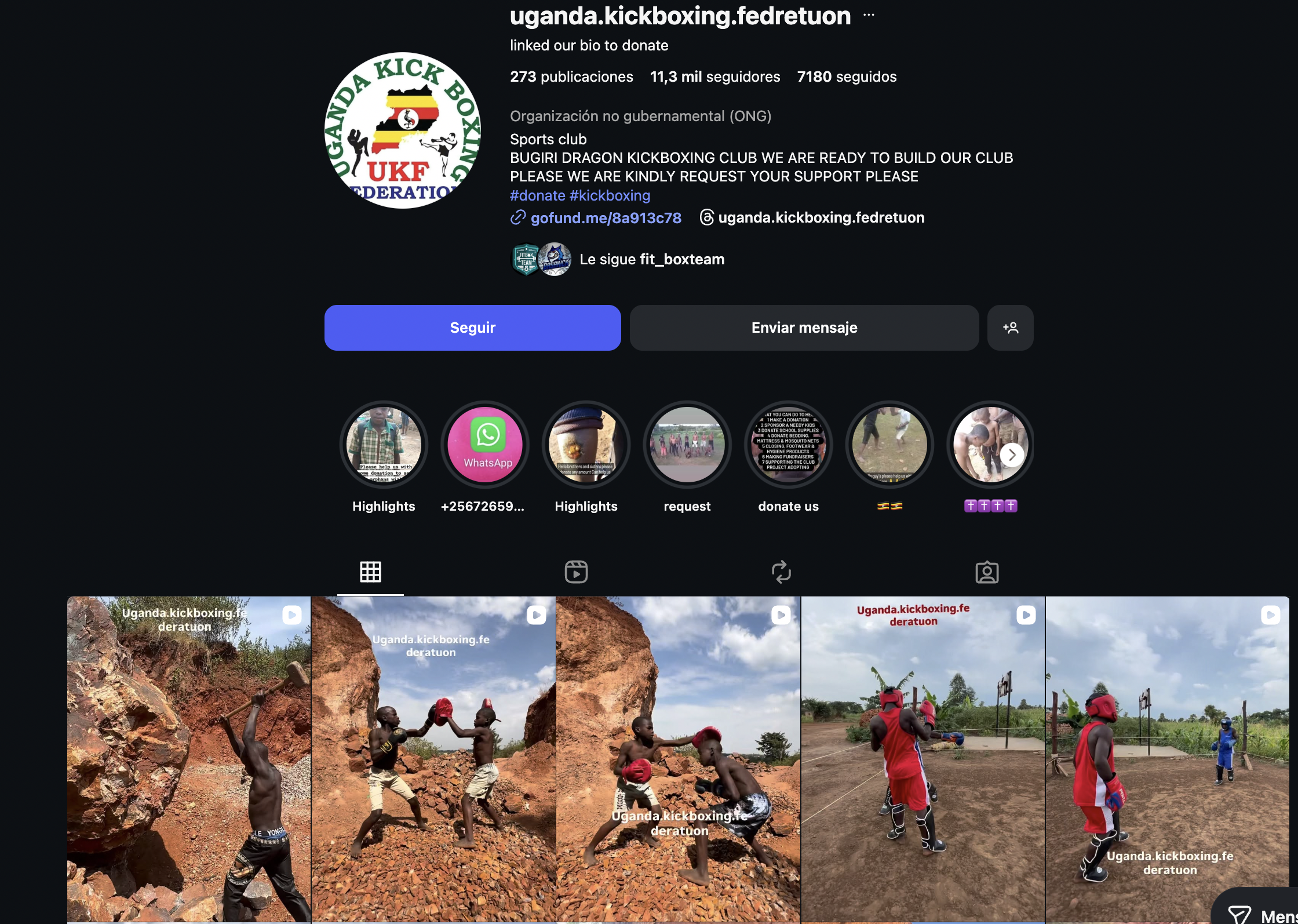 En ese momento encuentro una segunda cuenta con imágenes parecidas. Niños ugandeses luchando entre ellos. La cuenta se llama Allan Kickboxing y en la biografía tenemos el mismo gofundme.