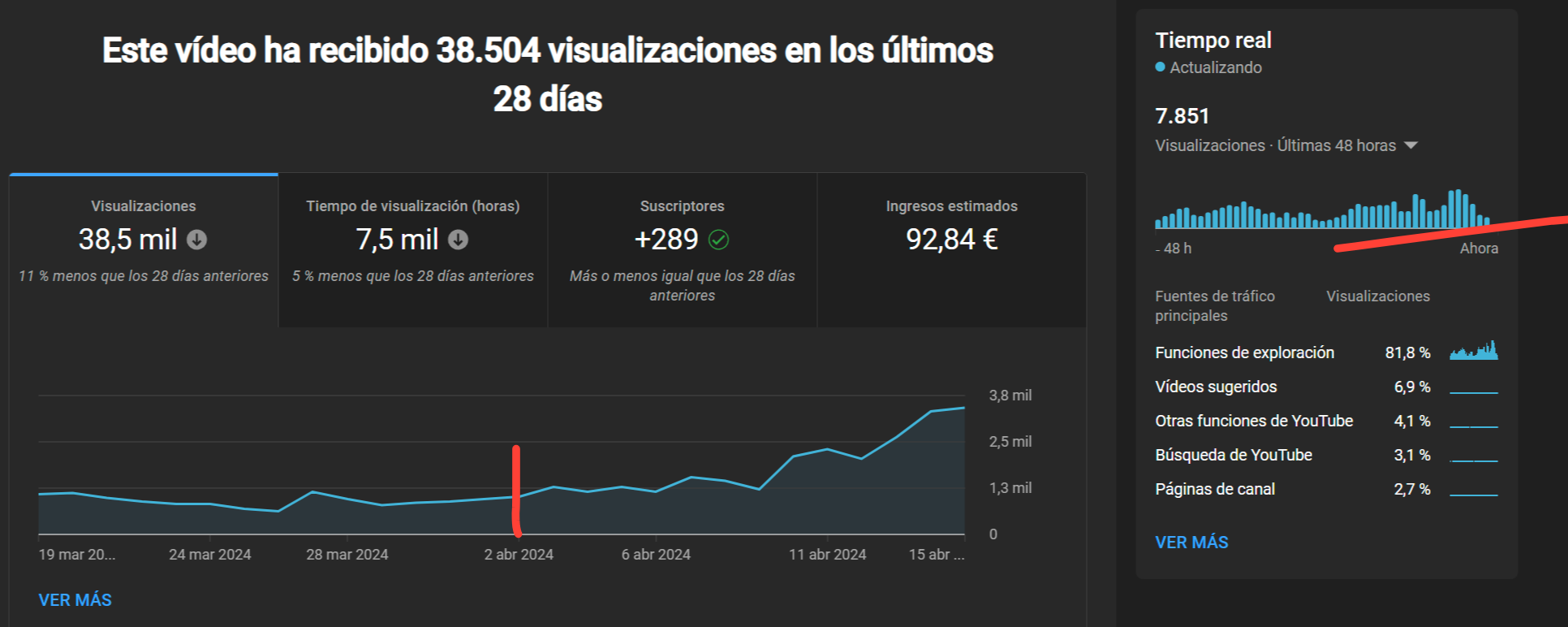 Importante: no he subido ningún vídeo a mi canal en los últimos veinte días. Eso hace que los resultados SÍ SEAN FIABLES, porque de lo contrario, el subir nuevos vídeos alteraría el comportamiento de los vídeos antiguos y no podríamos sacar conclusiones claras.