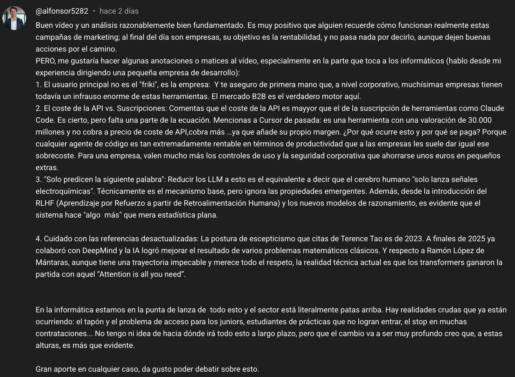 Por eso voy a responder a un mensaje que me dejaron en el vídeo de Anthropic. El mensaje está redactado con mucho respeto, y por eso quiero dejar claro que mi respuesta también es totalmente con buenas intenciones. Aunque en su mensaje hay alguna acusación errónea (como que uso referencias desactualizadas en el vídeo) que afecta a mi trabajo y que tengo que ser un poco tajante, pero no por eso hay acritud en mis palabras.
