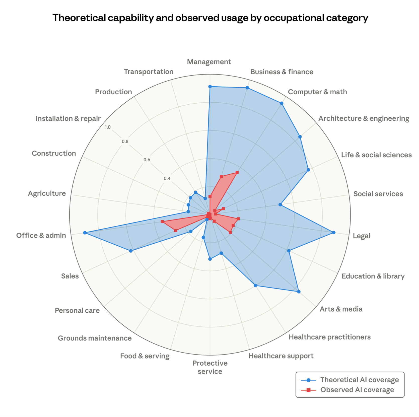 Era una buena chapa, pero para los nuevos, lo voy a resumir en dos frases: los economistas de Anthropic sacaron este gráfico diciendo que nos vamos a ir todos al paro porque la IA va a dejarnos sin trabajo. Se salvan los mecánicos de motos.